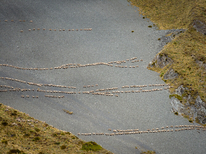 The main mob started to string across the shingle scree above us. The sight and sound of a few hundred merinos picking their way single file across a shingle face is something to behold. Robbie and Mike appeared over the saddle on the top beat with a handful of wethers to join the rest of the mob.